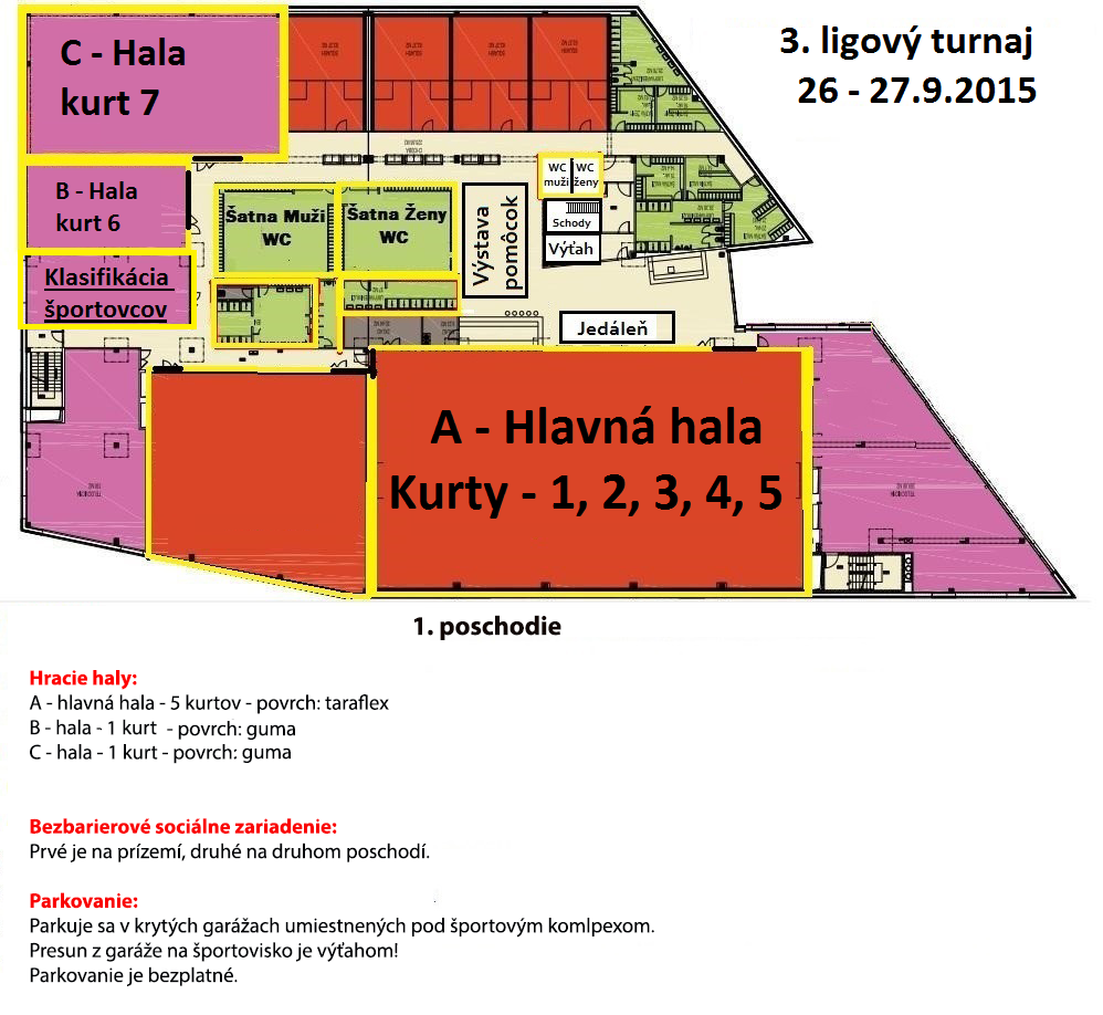 Z garáži sa ide na 1. poschodie, kde sa nachádzajú športové haly výťahom!