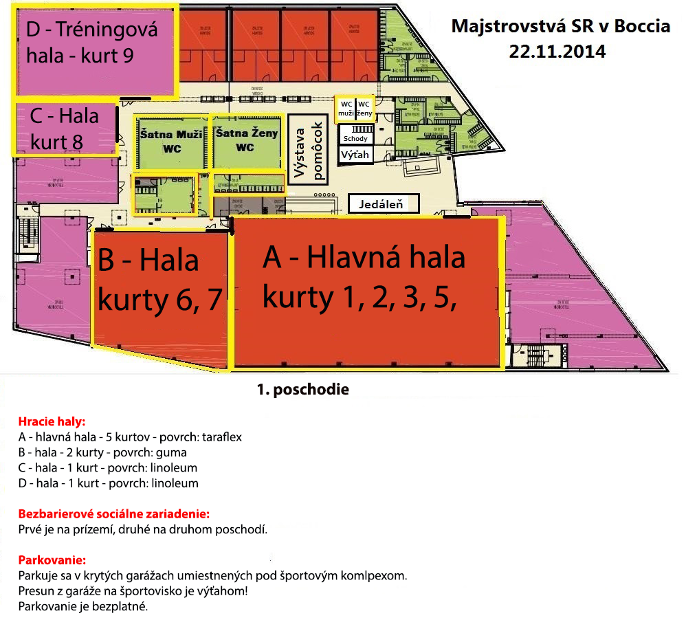 Z garáži sa ide na 1. poschodie, kde sa nachádzajú hracie kurty, výťahom!