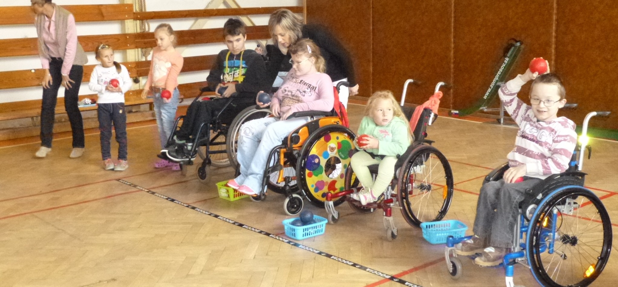 Stretnutie žiakov školy so športovcami – boccistami sa uskutočnilo v spolupráci s p. Molčanom, riaditeľom ZŠ Prostějovská. Po príchode do telocvične sme pripravili boccia kurt, a to tak, že sme špeciálnymi páskami vyznačili jeho hraničné čiary. Okolo 11- tej hodiny postupne prichádzali žiaci s vyučujúcimi a doprovodom. Stretnutia sa zúčastnilo 18 detí s ťažkým telesným postihnutím – vozičkárov, 4 učiteľky, rehabilitačná sestra a ďalších cca 30 detí. V úvode predseda ZOM Prešov Boris Klohna predstavil organizáciu ZOM Prešov, športový klub a bocciu. Informoval deti o histórii tohto športu, o jeho špecifikách, športovom náradí, jednotlivých kategóriách podľa zdravotného stavu, ako aj o možnostiach, ako sa do športovania zapojiť. Rovnako predstavil naše tréningové centrum na v Kultúrnom zariadení PKO Prešov – Sváby a motivoval deti k zapojeniu sa do pravidelného športovania. Boccia je jedinečný šport, vhodný pre ľudí aj s najťažším postihnutím, prináša so sebou rozvoj osobnosti, má v sebe pozitívny rehabilitačný a spoločenský prvok a navyše nie je náročný na špeciálne športoviská. Stačí telocvičňa, ktorá by mala byť v zimných mesiacoch vykurovaná. Na ZŠ Prostějovská boli teplotné podmienky ideálne. Škoda len, že škola nemá k dispozícii väčšiu telocvičňu. S kompletne bezbariérovým zázemím školy by bola, spolu s väčšou telocvičňou, ideálnym miestom pre turnaje i ligové kolá.