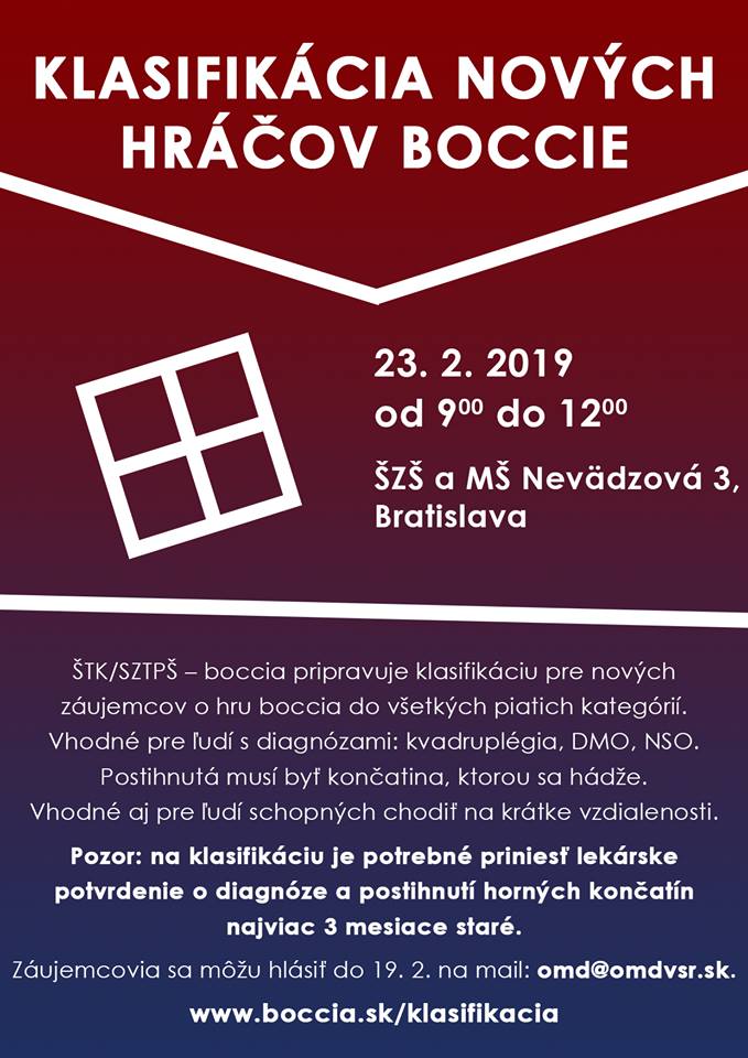 Druhou udalosťou, ktorá predchádza samotným turnajom, je klasifikácia nových hráčov. Konať sa bude 23. februára 2019 od 9:00 do 12:00 v priestoroch ŠZŠ Nevädzová 3 v Bratislave. Klasifikácia je vhodná pre nových hráčov s diagnózami kvadruplégia, detská mozgová obrna či nervovo-svalové ochorenia (napr. svalová dystrofia a pod.). Podmienkou je, aby dotyčný hráč mal poškodenie tej končatiny, ktorou bude bocciu hrávať. Na klasifikáciu je potrebné priniesť si lekárske potvrdenie o diagnóze najviac 3 mesiace staré. Prihlásiť sa môžete cez e-mail blazek@omdvsr.sk najneskôr do 19. februára.